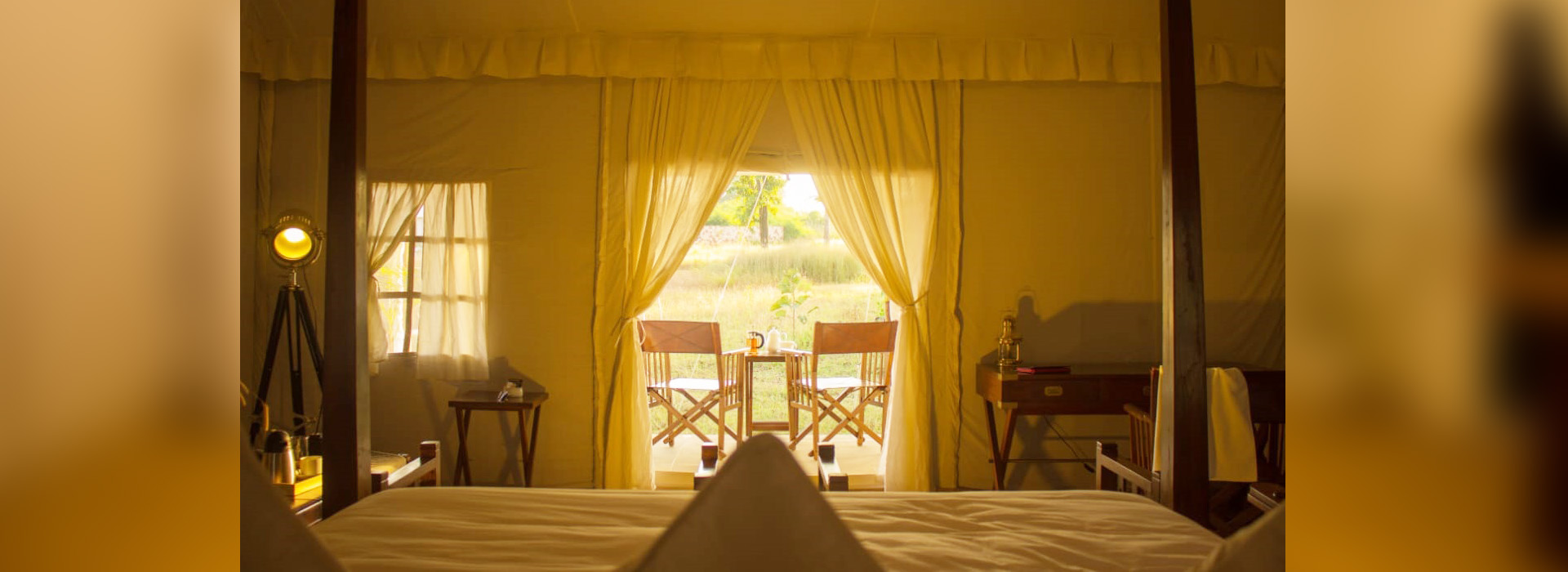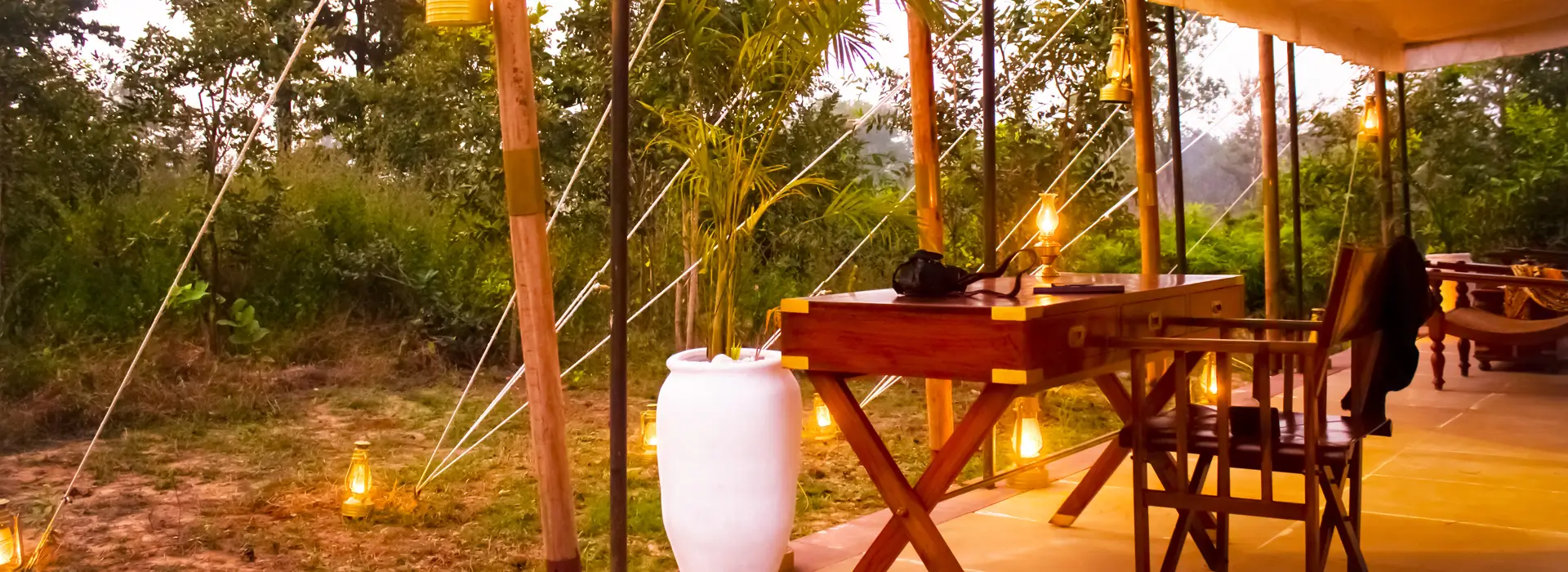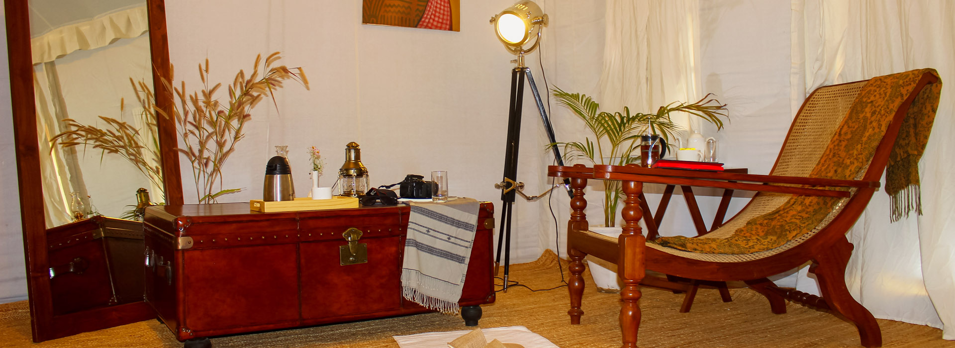 Canvas door opens onto your private verandah overlooking wild jungle grasses, and the vistas where one can lie down and relax on the colonial plantation chairs enjoying birdlife and gaze up at the stars.There are ample of electricity points inside the tent where one can charge all types of travelling gadgets and we do provide hairdryer.