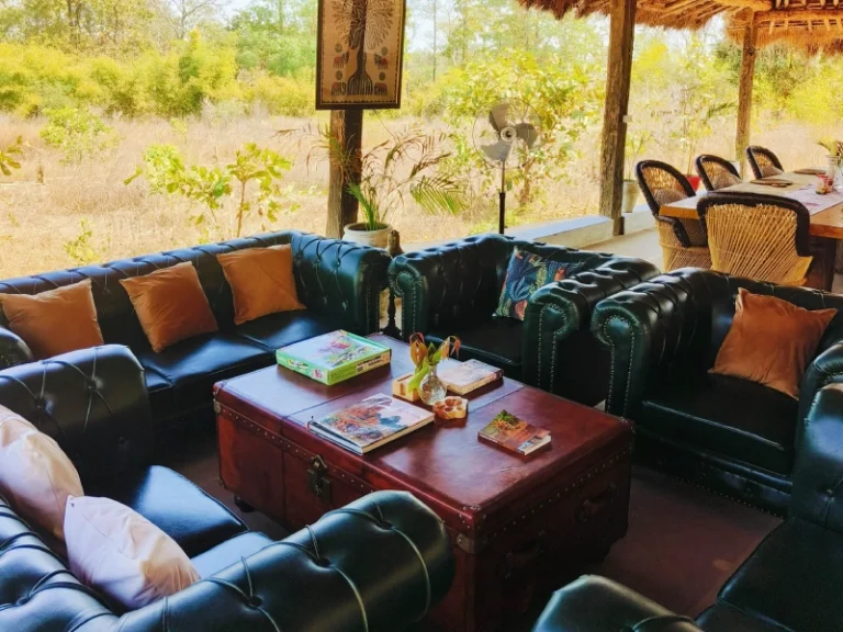Our tented accommodations reflect our dedication to sustainable tourism. Public areas are built using locally sourced waste wood and thatch, inspired by traditional village architecture. Natural floors made from cow dung and mud, along with open-air dining areas, reduce the need for artificial cooling and electricity. Unlike conventional resorts, our eco-friendly stays blend into the environment, offering guests an immersive nature experience while minimizing our environmental footprint.